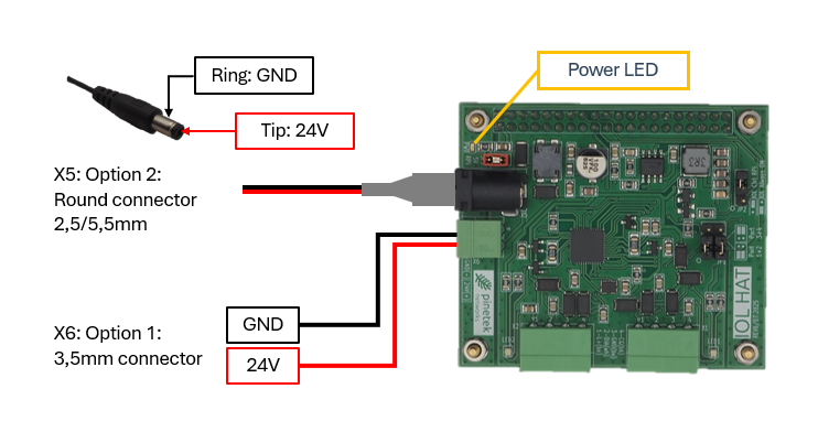 Only use one of the powering options, X5 or X6. If you use both options, you risk damaging of the power supplies, the IOL HAT and/or overheating.