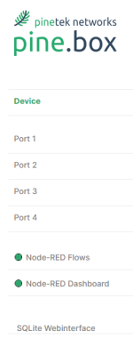 As you are already connected to the pine.box, you do not need to adjust the Network settings. If you anyways wish to do so, please check the corresponding section in the manual. Node-RED and Node-RED dashboards are enabled by default, so you will see a green circle left of the link, indicating that the service is running.