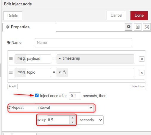 The inject node need so to be configured (double-click) to execute cyclically: