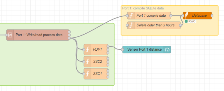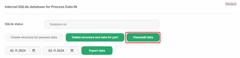 Copy the content (similar to 2.4 Add device process data to Node-RED) and import it to Node-RED (also as described in 2.4 Add device process data to Node-RED). The result will be a node group from SQLite data, that needs to be directly connected to the “value” output of the “Write/read process data” flow:
