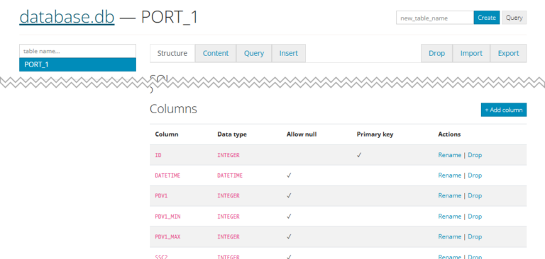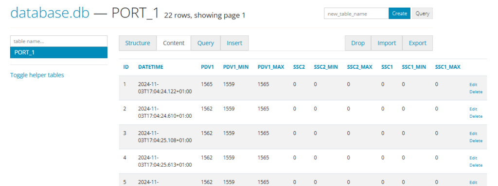 To view the process data in the SQLite frontend, select “Content” in the tabs of the SQLite page of the table that corrensponds to the port (in this example the table is “PORT_1”):