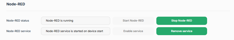 This section controls the Node-RED service. Node-RED can be manually started and stopped (“Start Node-RED” / “Stop Node-RED”). Please not that starting will take some time to complete. If Node-RED is stopped, the Node-RED Flows and Dashboard cannot be accessed, and the configured flows are not executed.