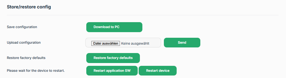 - Save/upload configuration: This saves and restores the user data (port configuration and IODDs, Node-RED configuration and nodes). The network configuration (see above) is not stored and restored.